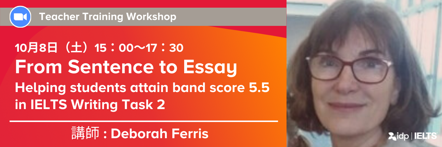 2022年10月8日(土)日本時間 15:00~17:30 | From Sentence to Essay – Helping students attain band score 5.5 in IELTS Writing Task 2 | Deborah Ferris |