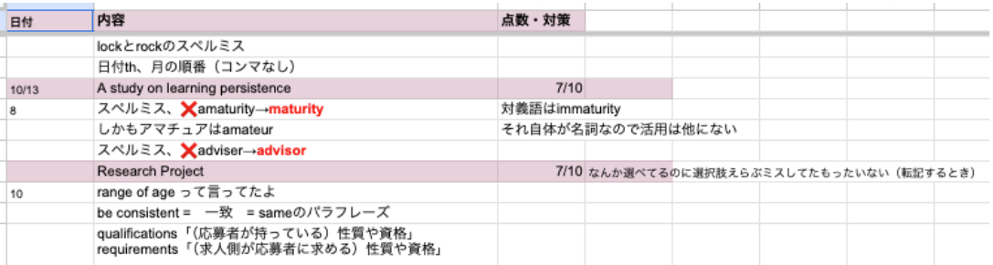 私の勉強スタイルは、4技能を通じて「とにかく量をこなし、間違った問題を分析して記録する」でした。そこから学んだ気づきすべてをスプレッドシートに細かく記録。人間はすぐに忘れて同じミスを繰り返してしまうものですが、記録を何度も振り返ることで次は気を付けようと意識できます。また、溜まった記録は自分専用のIELTS TIPSになるので、試験前ギリギリまで見直し、同じミスを繰り返さないようにしました。