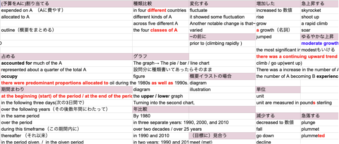 それから、1つの単語を他の言い方で表現できるよう、類義語の語彙も増やしました。特に私はグラフが苦手だったので、表現方法をストックさせ、グラフ周りの表現は瞬発的に出せるようにしました。